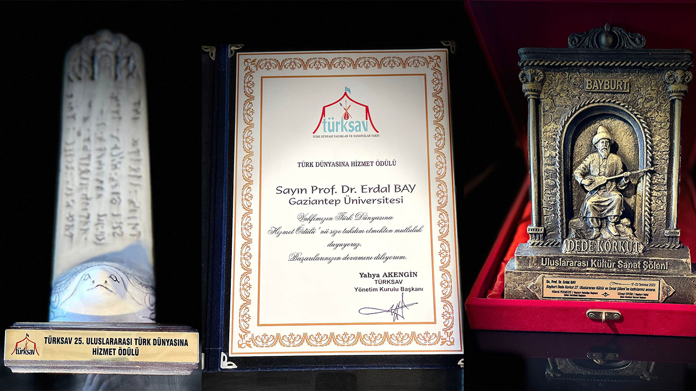 Türk dünyası ile ilgili çalışmaların jüri tarafından detaylı analizi sonucunda GAÜN Turizm Fakültesi Dekanı Prof. Dr. Erdal Bay, Türk Dünyasına Hizmet Ödüllüne layık görüldü. Prof. Dr. Bay’a ödülünü, Bayburt Üniversitesi Rektörü Prof. Dr. Mutlu Türkmen, Bayburt Belediye Başkanı Hükmü Pekmezci ve TURKSAV Genel Sekreteri Yavuz Gürler’den aldı.