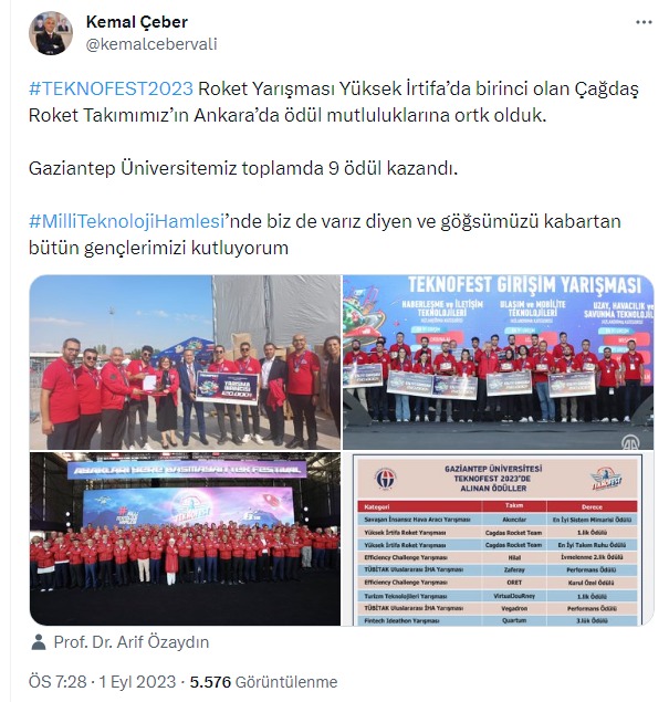 Gaziantep Valisi Çeber sosyal medya hesabından yaptığı kutlama paylaşımında,”TEKNOFEST 2023 Roket Yarışması Yüksek İrtifa’da birinci olan Çağdaş Roket Takımımız’ın Ankara’da ödül mutluluklarına ortak olduk. Gaziantep Üniversitemiz toplamda 9 ödül kazandı. Milli Teknoloji Hamlesi’nde biz de varız diyen ve göğsümüzü kabartan bütün gençlerimizi kutluyorum” ifadelerini kullandı.