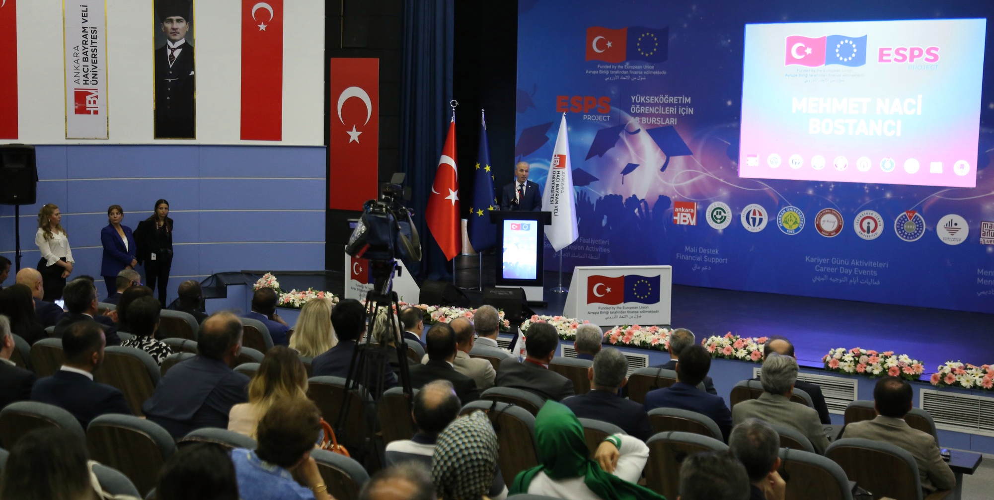 Avrupa Birliği tarafından fon sağlanan Yükseköğretim Öğrencileri için Avrupa Birliği Bursları (ESPS) Projesi, Ankara Hacı Bayram Veli Üniversitesi koordinatörlüğünde; Çukurova Üniversitesi, Gaziantep Üniversitesi, Harran Üniversitesi, Hatay Mustafa Kemal Üniversitesi, İskenderun Teknik Üniversitesi, Kahramanmaraş Sütçü İmam Üniversitesi, Kilis 7 Aralık Üniversitesi, Mardin Artuklu Üniversitesi ve Mersin Üniversitesi tarafından yürütülüyor. Avrupa Birliği Bursları (ESPS) Projesi Türkiye Ekonomisi ’ne Katkı Sağlıyor Avrupa Birliği Bursları Projesi’nin amacı Türk Cumhuriyeti Vatandaşı, uluslararası koruma statüsü altındaki ve geçici koruma statüsü altındaki öğrencilerin yükseköğretime erişimini artırarak kendi kendilerine yetebilmeleri için gerekli becerilere sahip olmalarını sağlamak ve bu sayede Türkiye’nin ekonomik büyümesine ve kalkınmasına katkıda bulunmaktadır. ESPS Projesi Lansman Etkinliği Yapıldı Ankara Hacı Bayram Veli Üniversitesi 100. Yıl Kültür Merkezi’nde ev sahipliğinde burs projesinin hedeflerini, planlanan faaliyetlerini ve önemini paylaşarak proje kapsamındaki paydaşları ve yararlanıcıları bir araya getirip fikir alışverişinde bulunmak amacıyla lansman etkinliği yapıldı. Etkinliğin açılış konuşması Ankara Hacı Bayram Veli Üniversitesi Rektörü Prof. Dr. Mehmet Naci Bostancı tarafından yapıldı. Akabinde Avrupa Birliği Türkiye Delegasyonundan Laurent Guirkinger ve Dış İşleri Bakan Yardımcısı ve AB Başkanı Mehmet Kemal Bozay birer konuşma yaptı. Etkinliğe ayrıca kamu kurum ve kuruluşlarının temsilcileri, misyon temsilcileri, sivil toplum kuruluşları, basın mensupları ve öğrenciler katıldı.