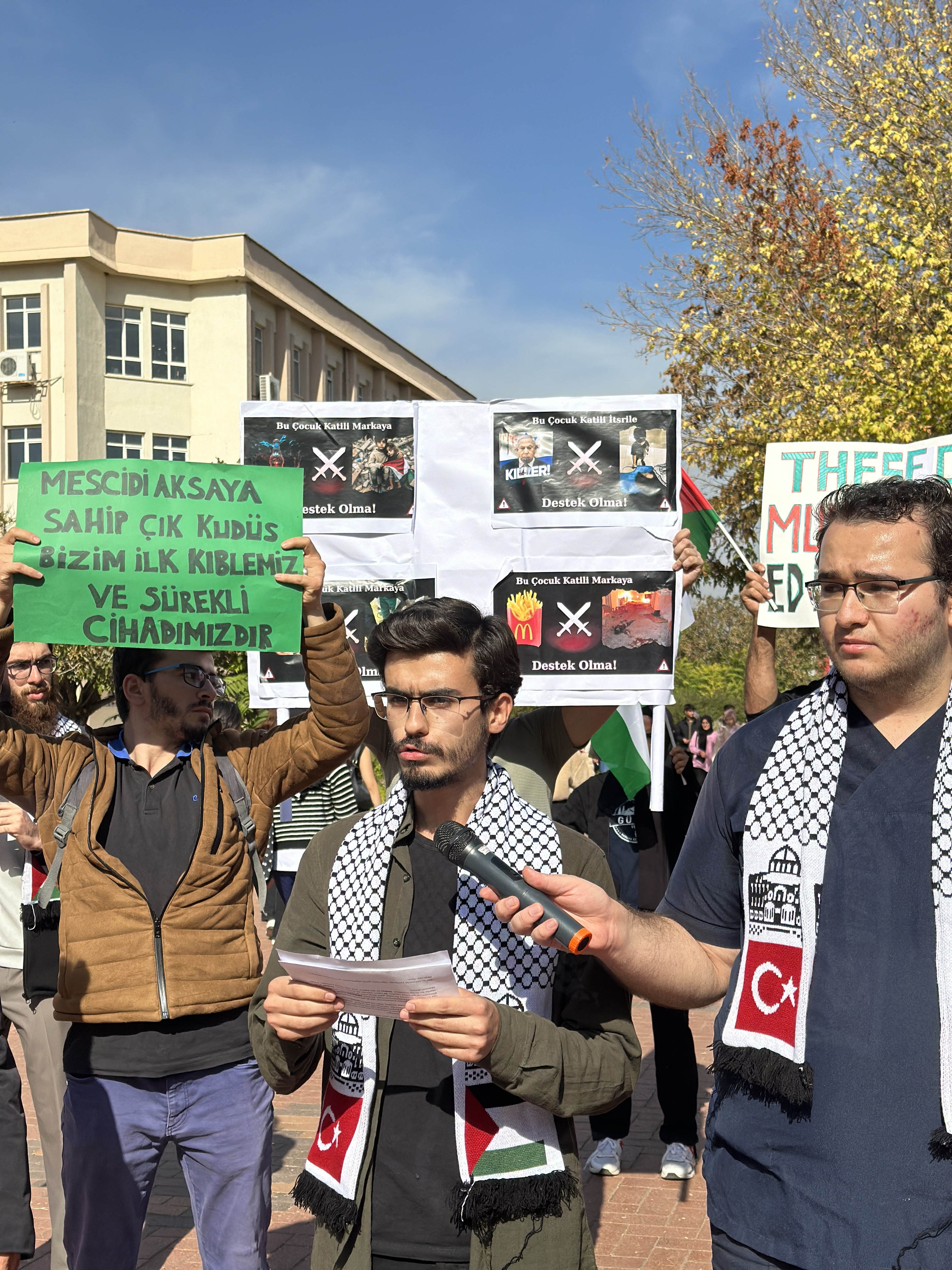 Üniversite öğrencileri olarak Filistin’in yanında olduklarını göstermek için Gaziantep Üniversitesi Öğrenci İşleri Daire Başkanlığı önünde toplanan gençler, “Çocuk uyuyunca susulur, öldürülünce değil”, “Mescid-i Aksa’ya sahip çık”, “Bu zalimler derhal durdurulmalı” pankartları açtı.