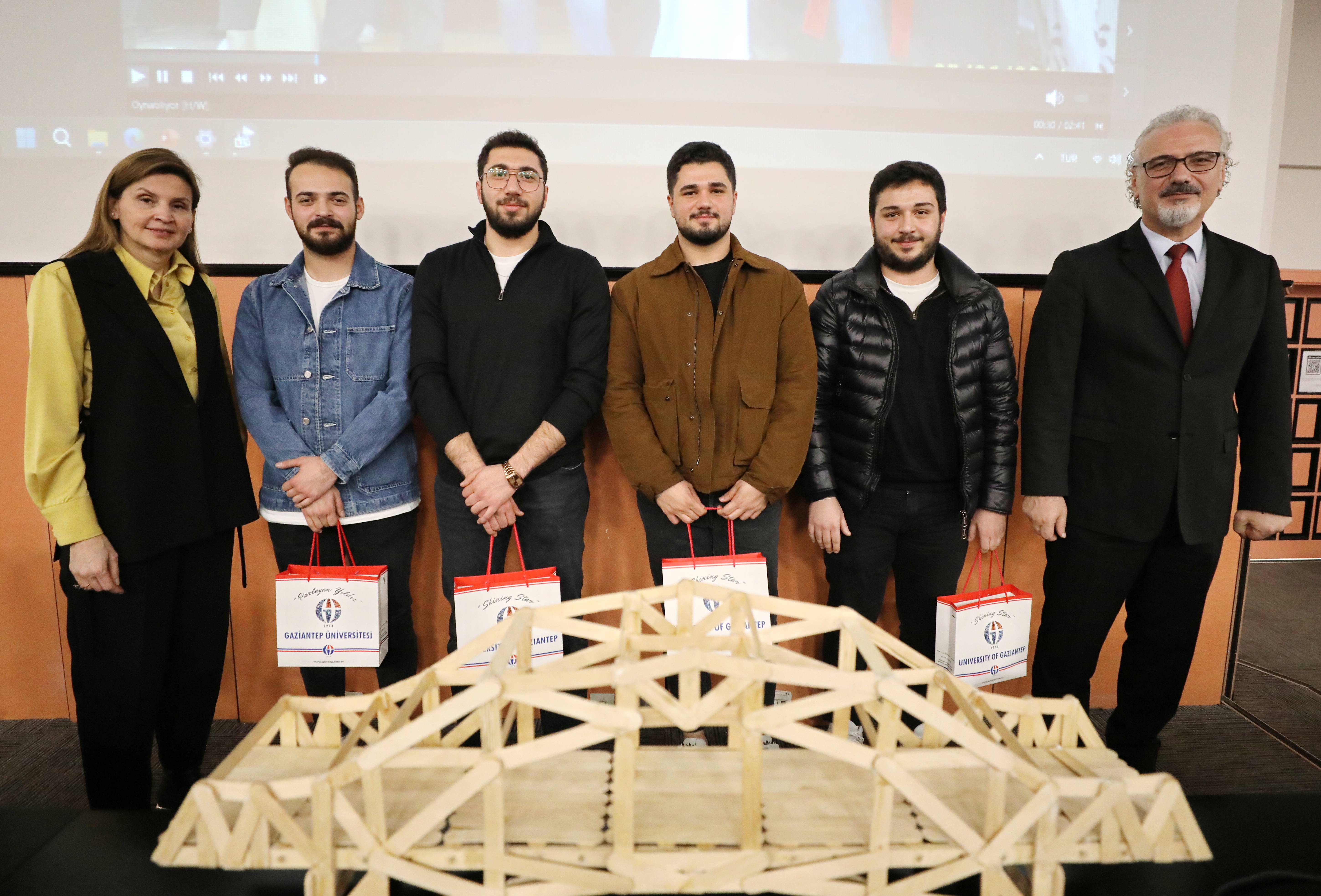 Açılış konuşması sonrasında Abeslang Köprü Yarışması’nda dereceye giren Gaziantep Üniversitesi İnşaat Mühendisliği öğrencilerineödülleri takdim edildi. Öğrencilere başarılarından dolayı teşekkür edilirken, bu tür yarışmalarda öğrencilerin üniversitenin adını en iyi şekilde temsil ettikleri vurgulandı.