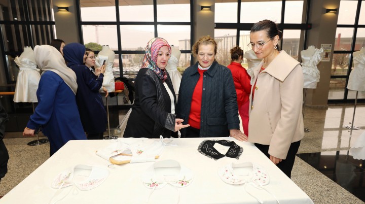 GAÜN Naci Topçuoğlu Meslek Yüksekokulu Öğretim Üyesi Doç. Dr. Sinem Güneşoğlu ve Öğr. Gör. Emine Nabioğlu koordinesinde hazırlanan sergide meslek yüksekokulu öğrencilerinin Gaziantep’in geleneksel kumaşlarından kutnu ve medaniye ile hazırladığı yelek tasarımları, giysi aksesuarları ve kumaş manipülasyonu ile hazırladıkları abiyeler sergilendi.