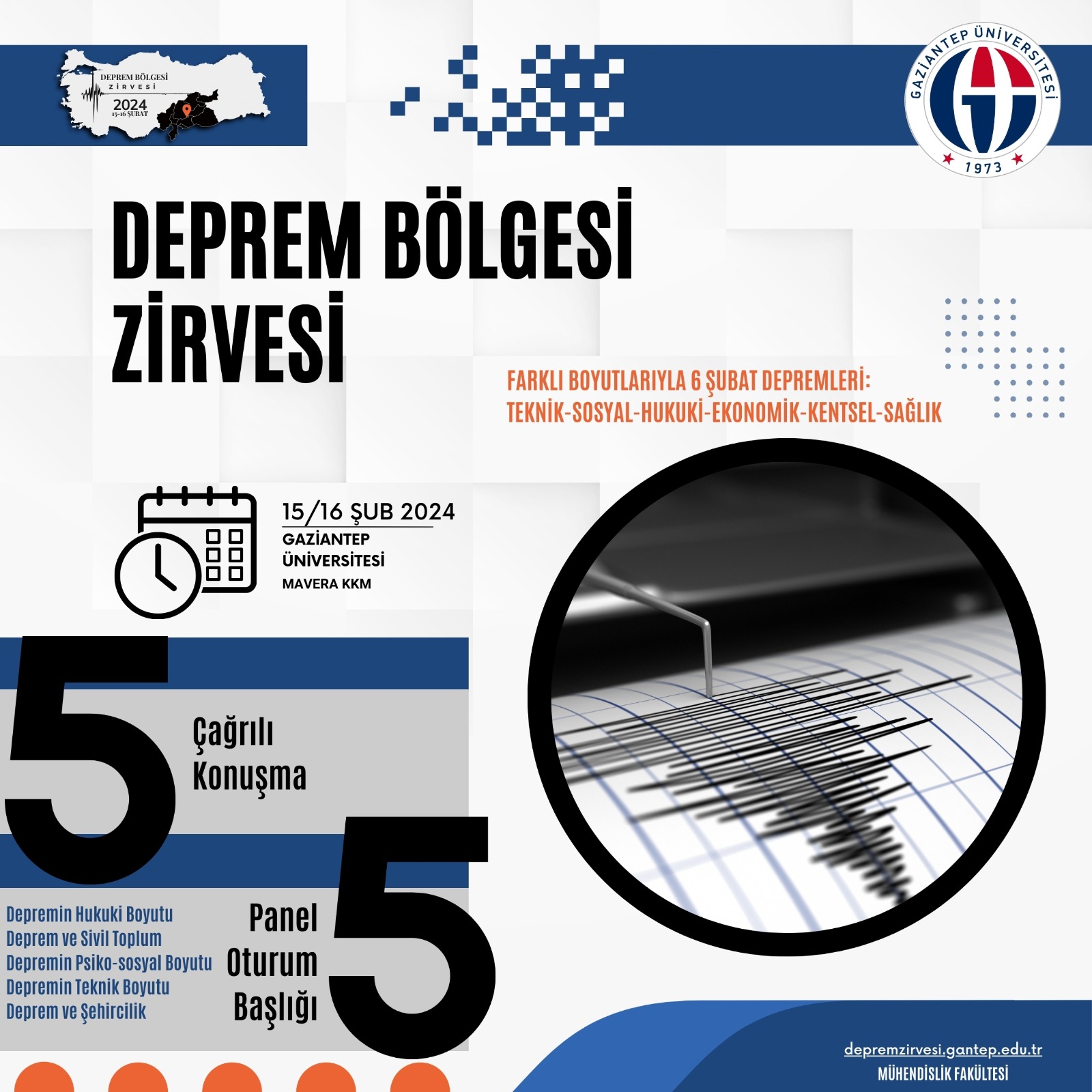 Gaziantep Üniversitesi (GAÜN) Mühendislik Fakültesi tarafından 15-16 Şubat 2024 tarihlerinde düzenlenecek olan ‘Deprem Bölgesi Zirvesi’ için on-line kayıtlar açıldı.