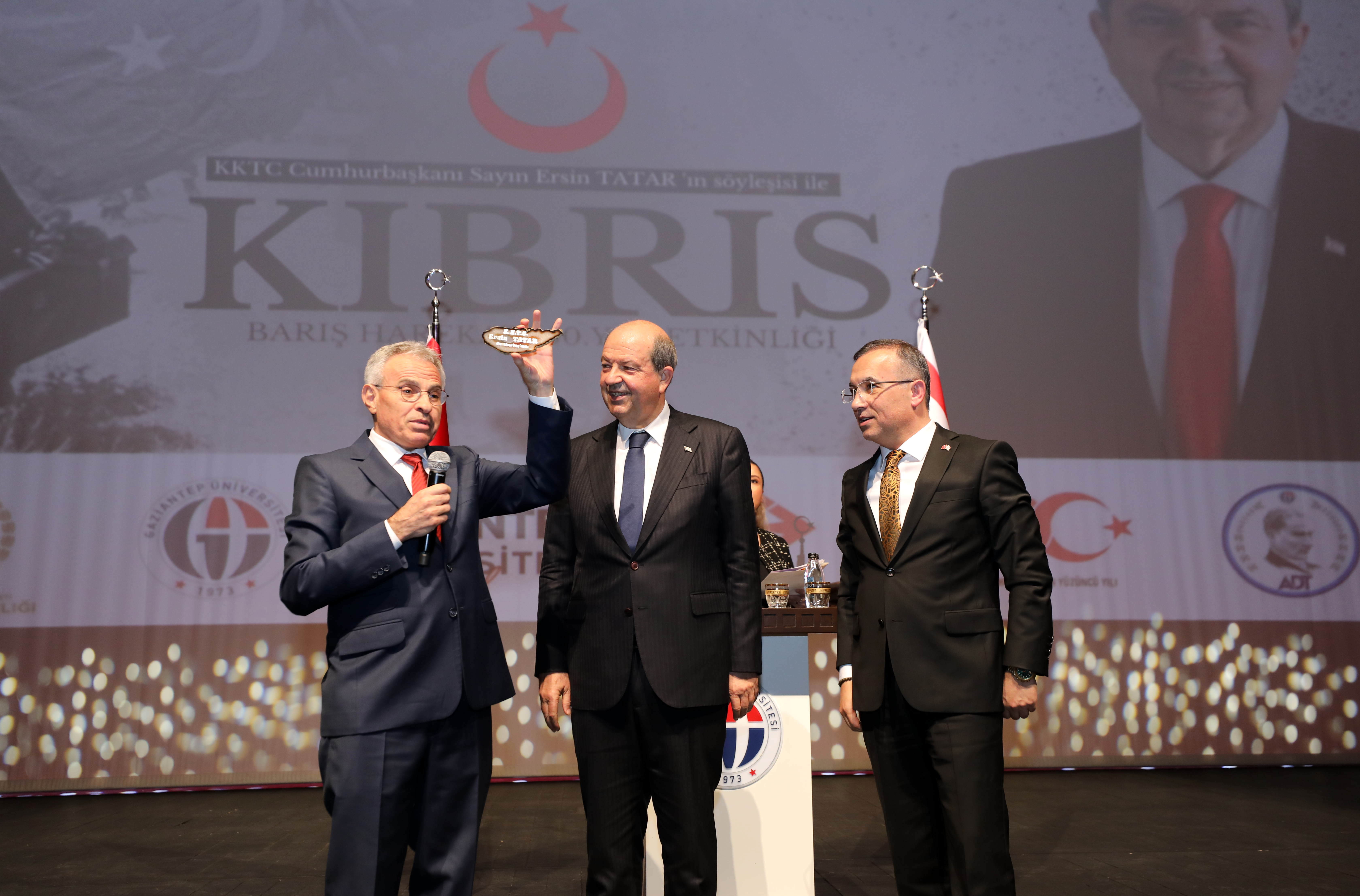 Etkinliğin sonunda Gaziantep Valisi Kemal Çeber ile GAÜN Rektörü Prof. Dr. Arif Özaydın günün anısına KKTC Cumhurbaşkanı Ersin Tatar’a hediye takdim etti.