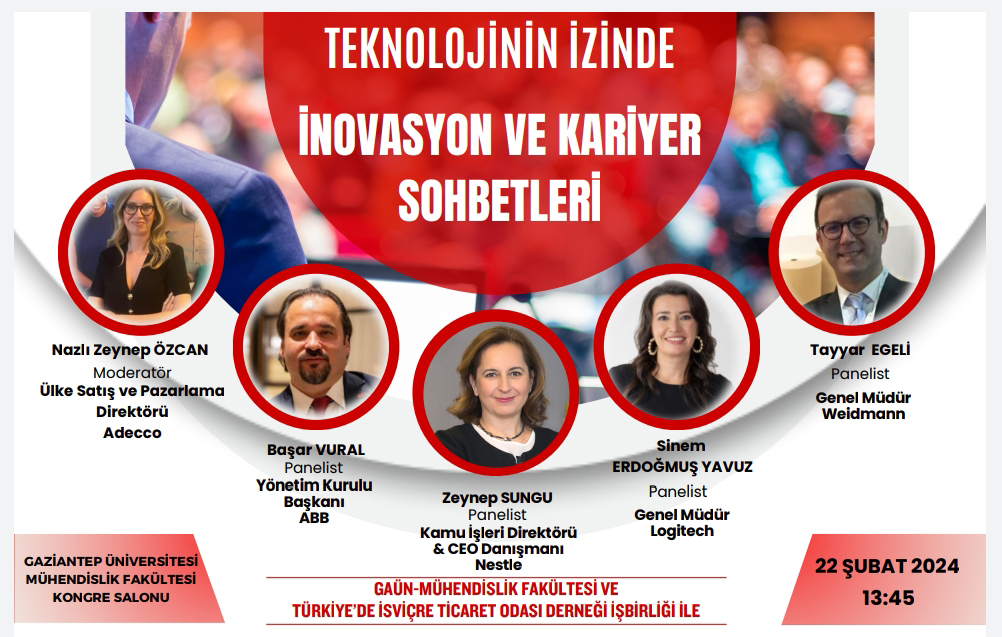 Gaziantep Üniversitesi (GAÜN) Mühendislik Fakültesi ve Türkiye’de İsviçre Ticaret Odası Derneği iş birliğiyle ‘Teknolojinin İzinde İnovasyon ve Kariyer Sohbetleri’ düzenlenecek.