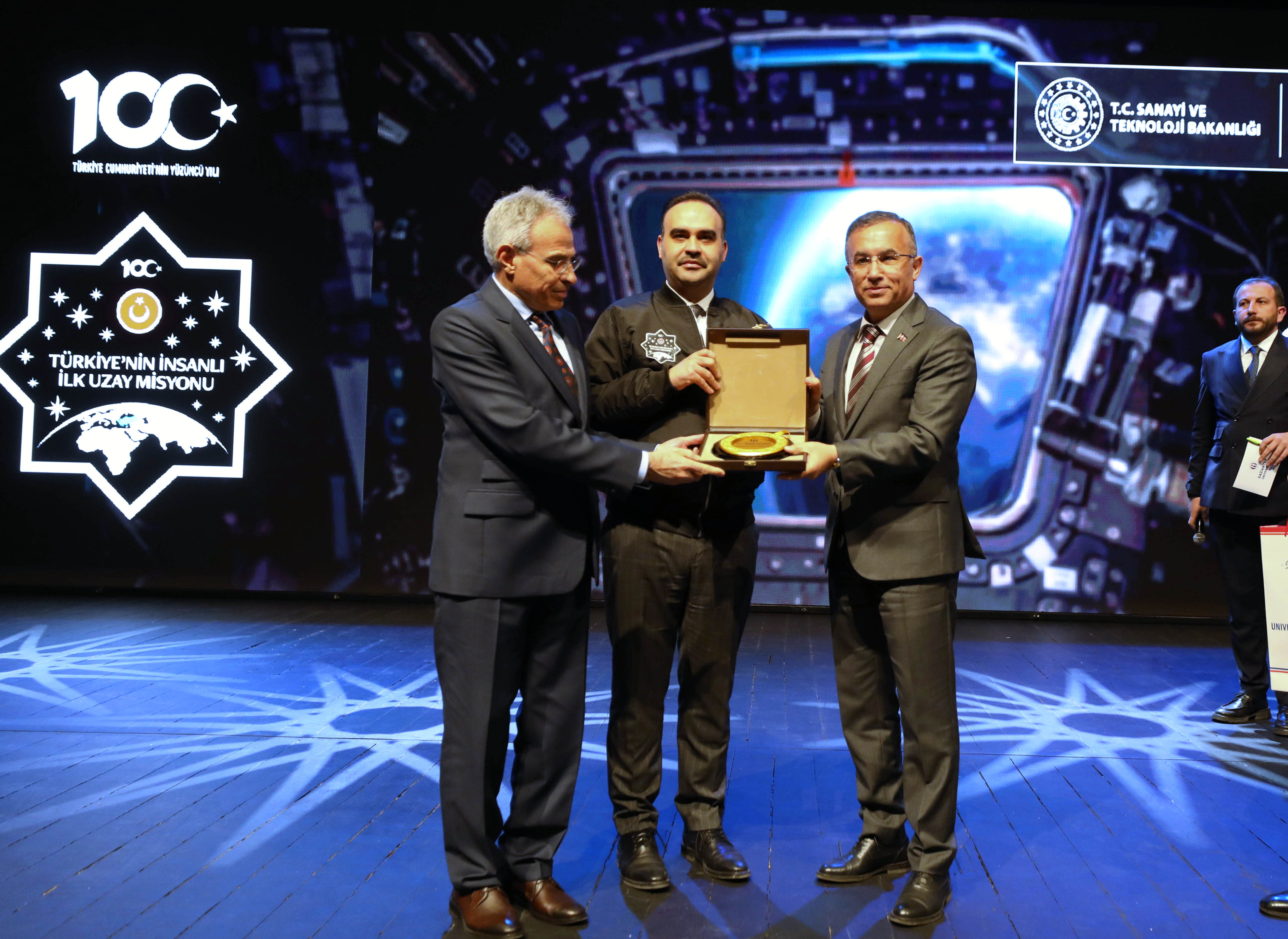 Rektör Prof. Dr. Arif Özaydın, programın sonunda Sanayi ve Teknoloji Bakanı Mehmet Fatih Kacır ve Türkiye Uzay Ajansı Yönetim Kurulu Üyesi ve ilk Türk astronot Alper Gezeravcı’ya hediye takdim etti.