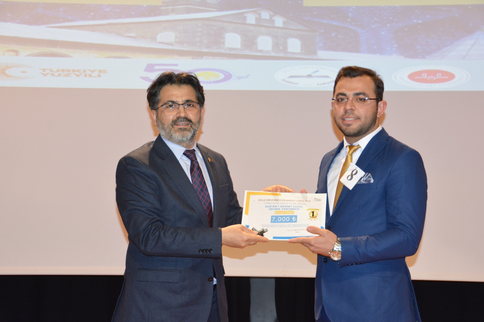 Birinci olan Ahmet Suci’ye ödülünü Dicle Üniversitesi Rektörü Prof. Dr. Mehmet Karakoç ve İl Müftüsü Celal Büyük’ten aldı.