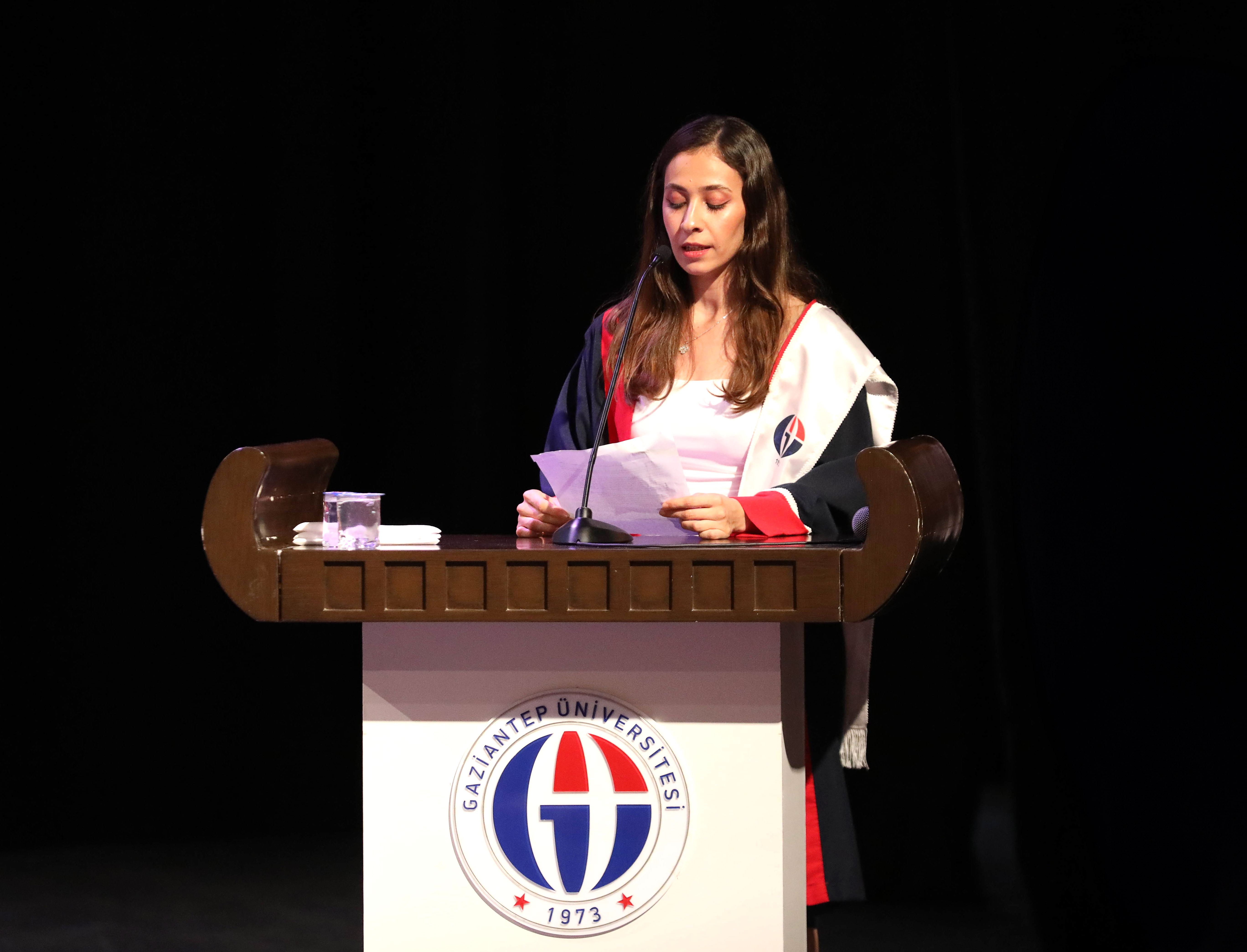 Mezun öğrenciler adına konuşan dönem birincisi Özge Yıldız, fakülteyi birincilikle bitirmenin mutluluğunu ve gururunu yaşadığını belirterek, “Hedefimize ulaşmada Gaziantep Üniversitesinde aldığımız eğitim ve kararlılığımız yol gösterecektir. Başarılı olmak için dik duracak, engelleri bir bir aşacak, üniversitemizin bize kazandırdığı sorgulayarak öğrenme ve sürekli kendini yenileme alışkanlıklarımızı genç kuşaklara aşılamaktan asla vazgeçmeyeceğiz.” diye konuştu.