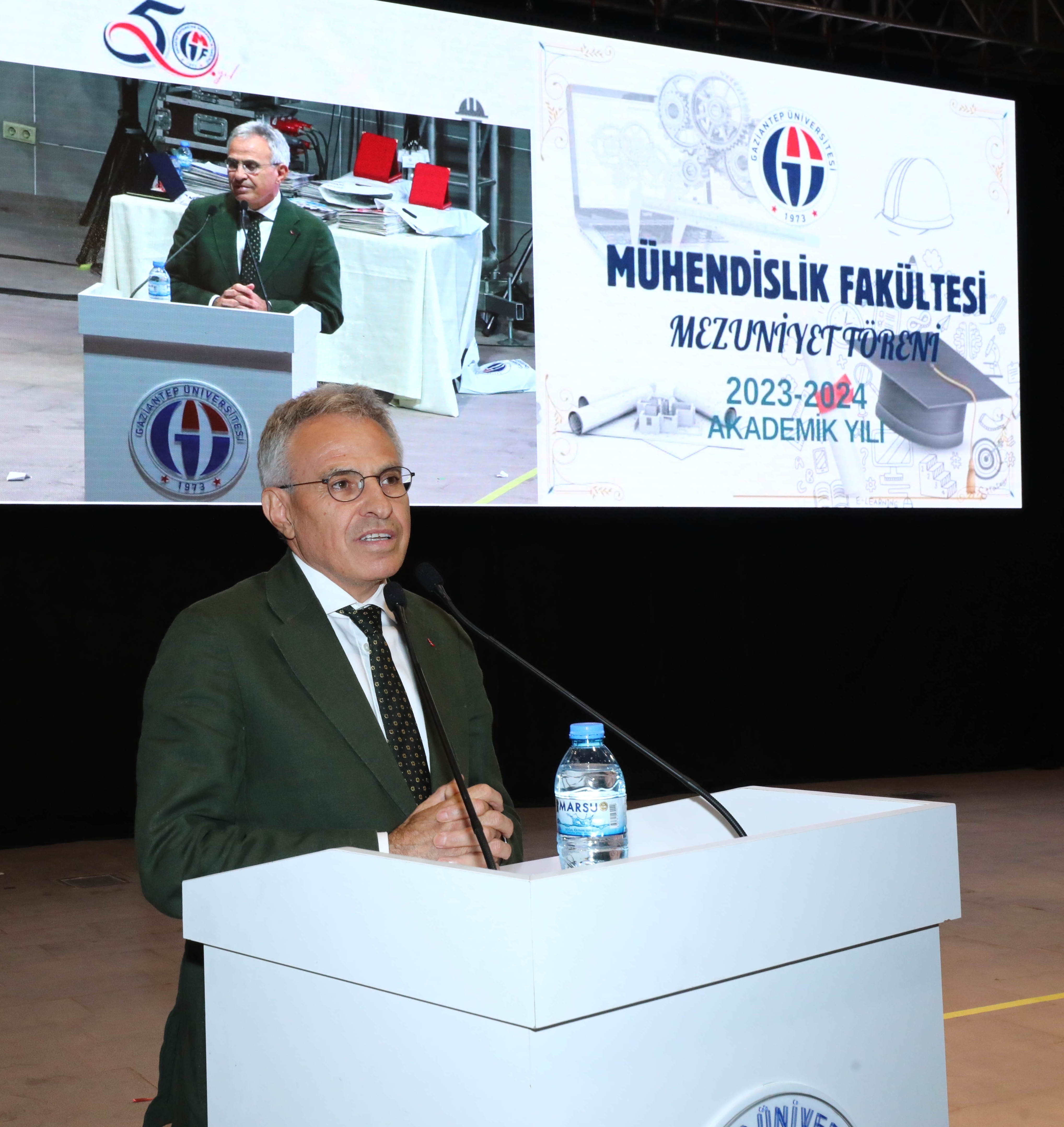GAÜN Rektör Yardımcısı Prof. Dr. Recep Yumrutaş ise mezunları tebrik ederek şu ifadeleri kullandı: “Eğitiminiz boyunca derslerde sizlere soru sorabilmeyi, düşündüklerinizi ifade edebilmeyi, fikirlerinizi paylaşmayı, hayal ettiklerinizi tasarlamayı, başkalarının fikirlerine saygı duymayı, herkesle dostluk ve kardeşlik içinde yaşamayı ve en önemlisi de ‘problem çözme sanatı’ olarak tanımladığımız mühendisliği öğretmeye çalıştık. Mühendislik eğitiminiz neticesinde mühendislik problemlerinin yanında sosyal problemleri de çözebilme kabiliyetini kazandığınızı düşünüyorum. Tüm bunların sonucunda ise sizlerden; her ne olursa olsun hakkaniyetli ve adil bir insan olmanızı, bildiklerinizi çevrenizle paylaşmanızı, hayal kurmanızı, düşünmenizi, çalışmadan emek vermeden hiçbir şeye sahip olmamanızı, birlikteliğin değerini bilmenizi, ülkemizin gelişmesi için çaba göstermenizi ve katma değer üretmenizi,ailenize, çevrenize ve ülkemize faydalı birer insan olmanızı bekliyoruz.”
