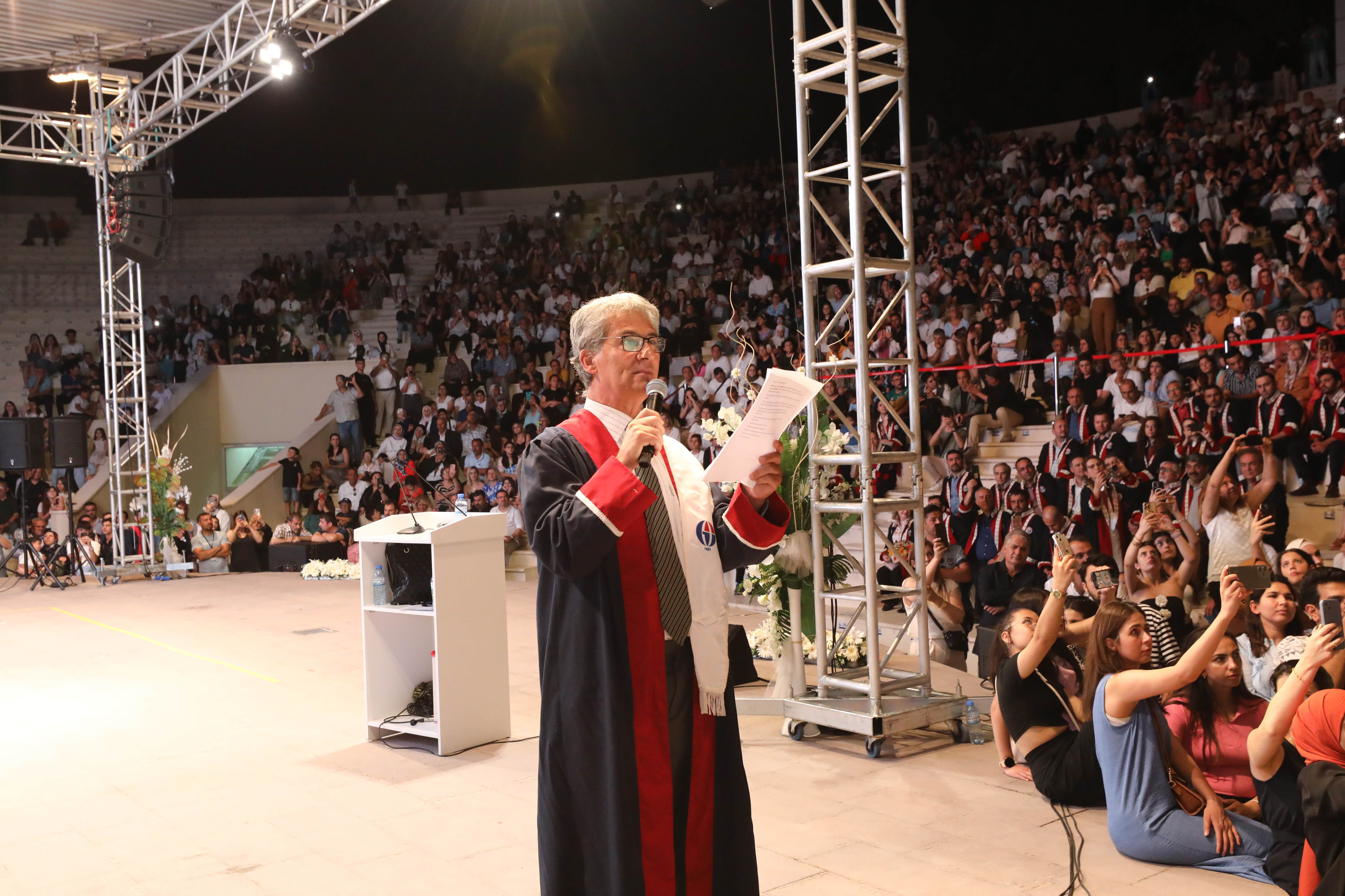 Mezuniyet programının açılışında konuşan GAÜN Rektörü Prof. Dr. Arif Özaydın, her bir öğrencinin başarısının Gaziantep Üniversitesi ailesi için gurur kaynağı olduğunu, mezuniyet gününde bu gururu yaşamanın ayrı bir mutluluk verdiğini söyledi. Prof. Dr. Özaydın konuşmasının devamında, “Ülke olarak zor dönemlerden geçiyoruz ama her karanlık dönemin arkasında aydınlık var. Bilgi çağının çocuklarını gördükçe umutlanıyorum; onlar Türkiye’nin geleceği. Bu geleceği inşa eden hocalarımıza ve destek olan ailelere ayrıca teşekkür ediyorum. Öğrencilerimize, onların kariyer yolculuklarında bir ekonomi hocası olarak şu önerilerde bulunmak istiyorum: Size ilk teklif edilen işe girin, sonra ikinci işi bulursunuz. İş dünyasına giriş yapmanız çok önemli. İlk bulduğunuz iş size değer katar ve deneyim kazandırır. Ülkemizde iş beğenmeme işsizliği var. İş beğenmezlik yapmayın.” diye konuştu.