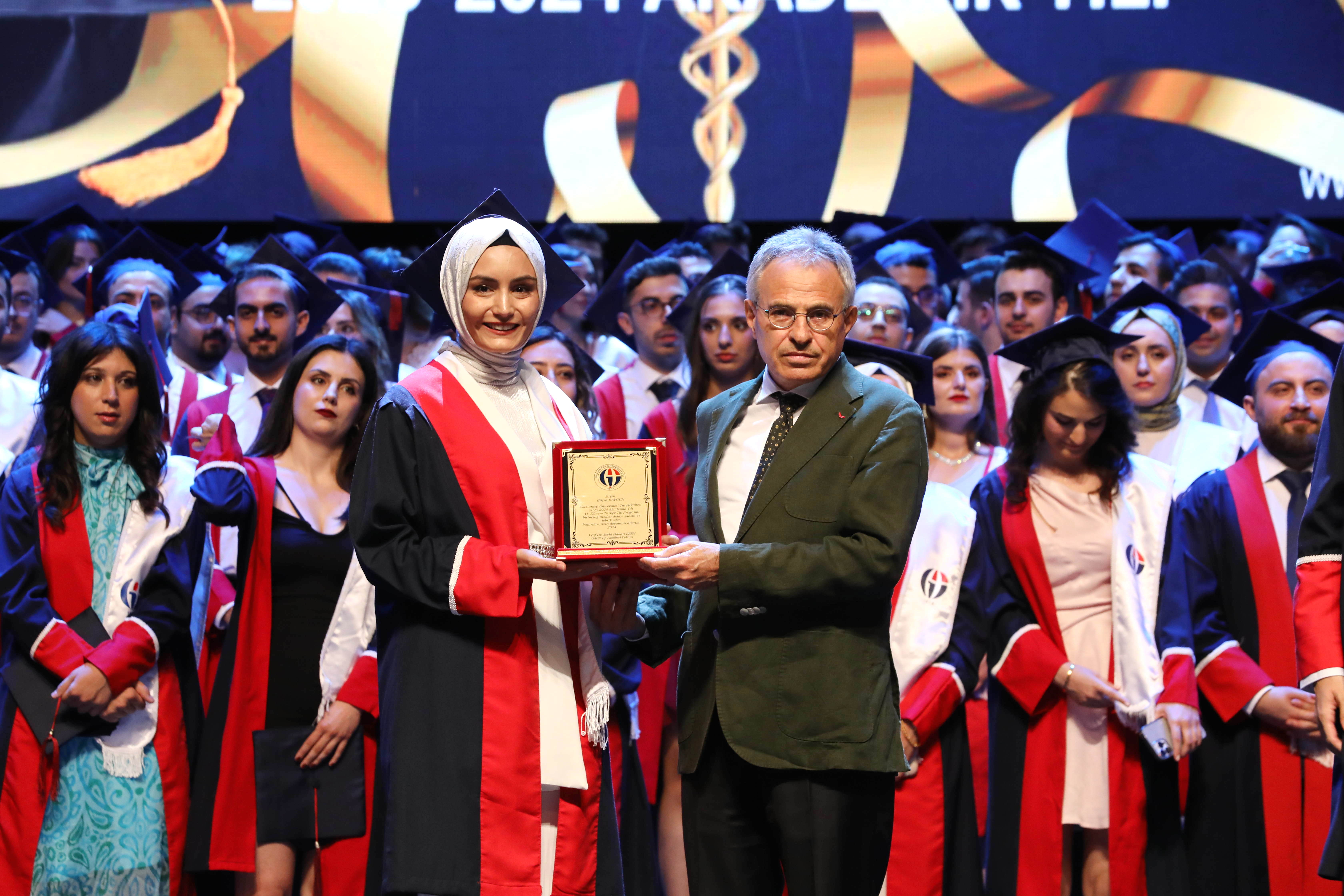 GAÜN Türk Musikisi Devlet Konservatuarı Öğr. Gör. Hüseyin Kaynak ve ekibinin mini bir dinleti sunduğu diploma töreninin açılışında konuşan GAÜN Rektörü Prof. Dr. Arif Özaydın, mezun öğrencileri yürekten tebrik ederek, “Ülkenizi terk etmeyin, mesleğinizi burada icra edin.”  dedi.  Prof. Dr. Özaydın sözlerinin devamında mezun ailelerine seslenerek, “Eğitim için gönderdiğiniz çocuklarınızı doktor olarak teslim ediyoruz. Sizleri ahlaklı ve edepli çocuklar yetiştirdiğiniz için tebrik ediyorum. Medeniyetimizde, ‘Bana bir harf öğretenin kırk yıl kölesi olurum’ sözünden hareketle hocalarımıza çok teşekkür ediyorum. Burada dünyanın dört bir tarafından öğrencimiz var. Küresel bir üniversite ve şehiriz. Küresel dünyaya doktor yetiştiriyoruz” ifadelerinde bulundu.