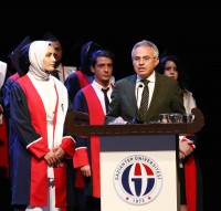 Doktorluk mesleğine adım atan mezun öğrencileri tebrik eden Prof. Dr. Şevki Hakan Eren, “Giyeceğiniz beyaz önlüğünüz; sevginin, dürüstlüğün, şefkatin ve özverinin sembolü olsun. Lütfen meslek hayatınız boyunca başta meslektaşlarınıza iyi davranın mümkünse hastalarınıza kızmayın, geniş olun ve evde sizi bekleyen ailelerinizi ihmal etmeyin.” diye konuştu.