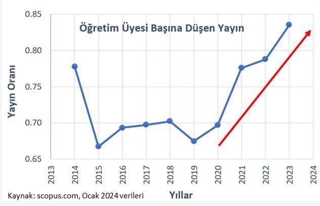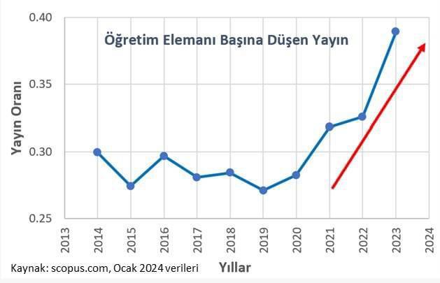Dünya genelindeki üniversitelerin sosyal, bilimsel etkisini ve yenilikçiliğini ölçen “SCImago University Rankings 2024 (scopus.com)” verilerine göre, GAÜN’de öğretim üyesi başına düşen yayın sayısı 2013 yılından itibaren belirgin bir yükseliş göstererek 2023 yılında 0.85 seviyesine ulaştı. Aynı şekilde, öğretim elemanı başına düşen yayın oranı da 2013 yılından itibaren artarak 2023 yılında 0.40 seviyesine kadar çıktı.