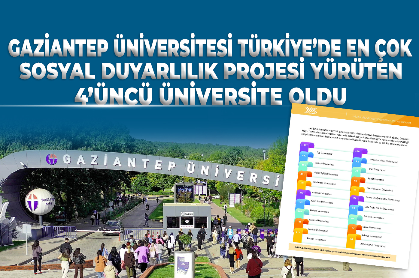 Yükseköğretim Kurulu (YÖK) tarafından yayımlanan “2024 Üniversite İzleme ve Değerlendirme Genel Raporu”na göre Gaziantep Üniversitesi (GAÜN), gerçekleştirdiği sosyal duyarlılık projeleri ile Türkiye genelindeki üniversiteler arasında 4’üncü sıraya yerleşti. Raporda, GAÜN’ün 287 sosyal duyarlılık projesi yürüttüğü belirtiliyor. GAÜN’ün bu başarısı, her üniversitenin geçmiş yıllara ait verileri dikkate alınarak yapılan değerlendirme sonucunda elde edildi. GAÜN, genel ortalamanın üzerinde bir performans sergileyerek sosyal…