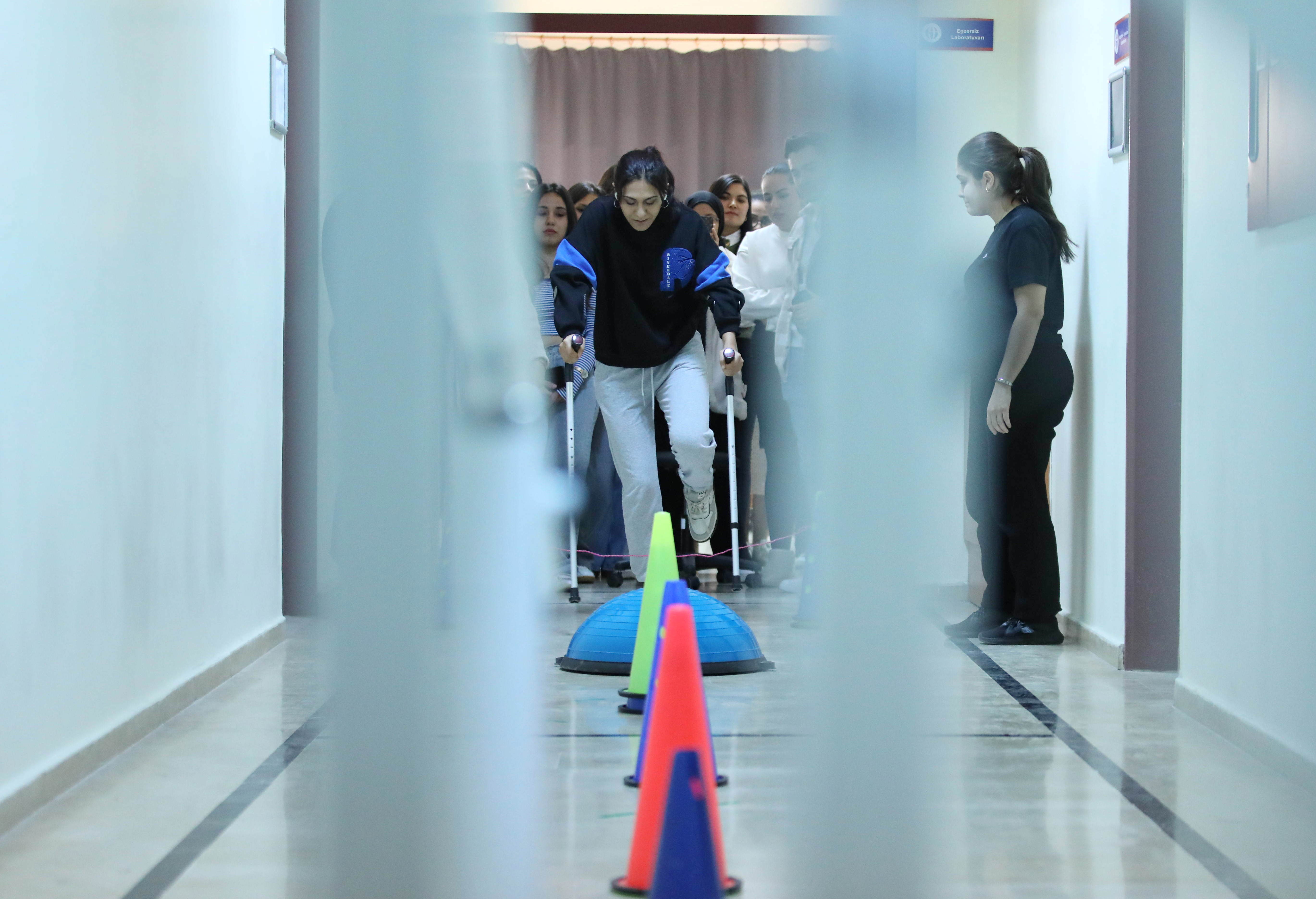 Empati etkinliğinde öğrenciler, hazırlanan parkurda dört takım halinde koltuk değnekleriyle ampute bir hasta ile işitme engelli bir hastayı canlandırdı.