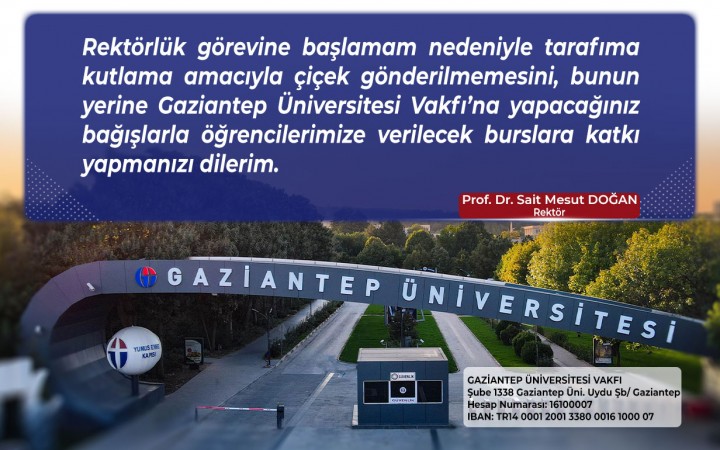 Rektörlük görevine başlamam nedeniyle tarafıma kutlama amacıyla çiçek gönderilmemesini, bunun yerine Gaziantep Üniversitesi Vakfı’na yapacağınız bağışlarla öğrencilerimize verilecek burslara katkı yapmanızı dilerim.