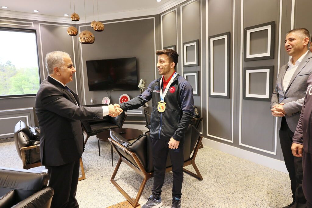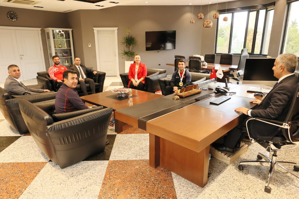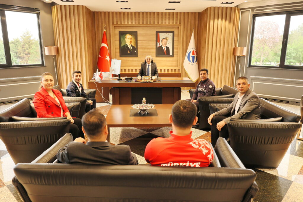 Rektörlük makamında gerçekleşen ziyarette, 55 kilo kategorisinde koparmada 112 kilogram kaldırarak Avrupa şampiyonu olan Harun Algül’ün elde ettiği başarının hem üniversite hem de ülke adına büyük bir gurur kaynağı olduğunu belirten Rektör Doğan, sporcuyu ve Milli Takım Antrenörü Mehmet Doğan’ı tebrik etti.