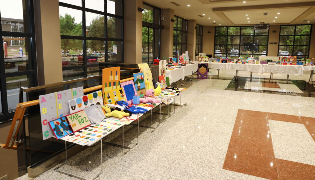 Sergide, öğrencilerin çocukların bilişsel ve motor becerilerini desteklemek için hazırladığı el yapımı oyuncaklar, hikaye kitapları ve etkinlik setleri yer aldı. Çalışmalar, öğrencilerin yaş gruplarına uygun projeler geliştirme becerilerini yansıttı.