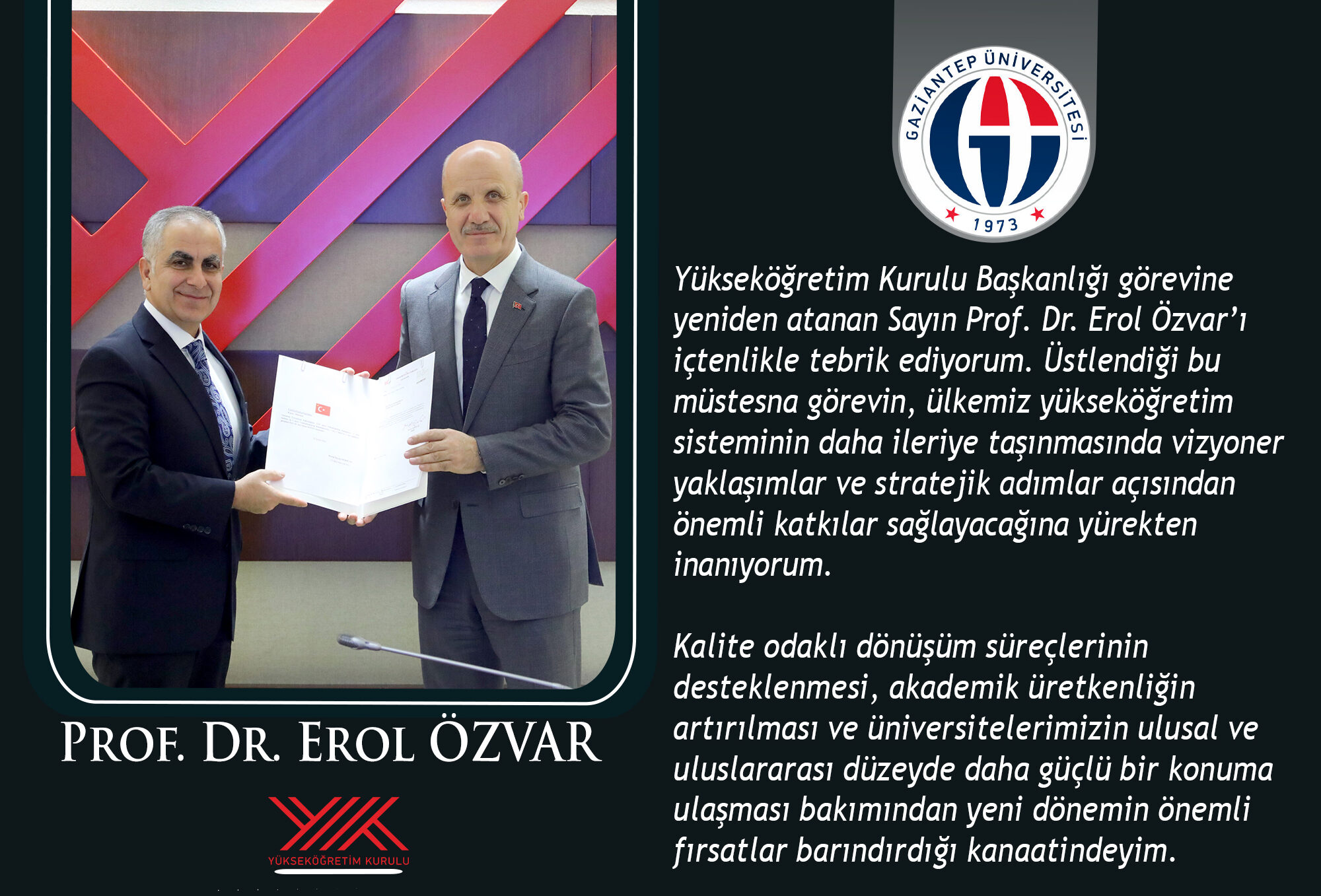 Yükseköğretim Kurulu Başkanlığı görevine yeniden atanan Sayın Prof. Dr. Erol Özvar’ı içtenlikle tebrik ediyorum. Üstlendiği bu müstesna görevin, ülkemiz yükseköğretim sisteminin daha ileriye taşınmasında vizyoner yaklaşımlar ve stratejik adımlar açısından önemli katkılar sağlayacağına yürekten inanıyorum. Kalite odaklı dönüşüm süreçlerinin desteklenmesi, akademik üretkenliğin artırılması ve üniversitelerimizin ulusal ve uluslararası düzeyde daha güçlü bir konuma ulaşması bakımından yeni dönemin önemli fırsatlar barındırdığı…