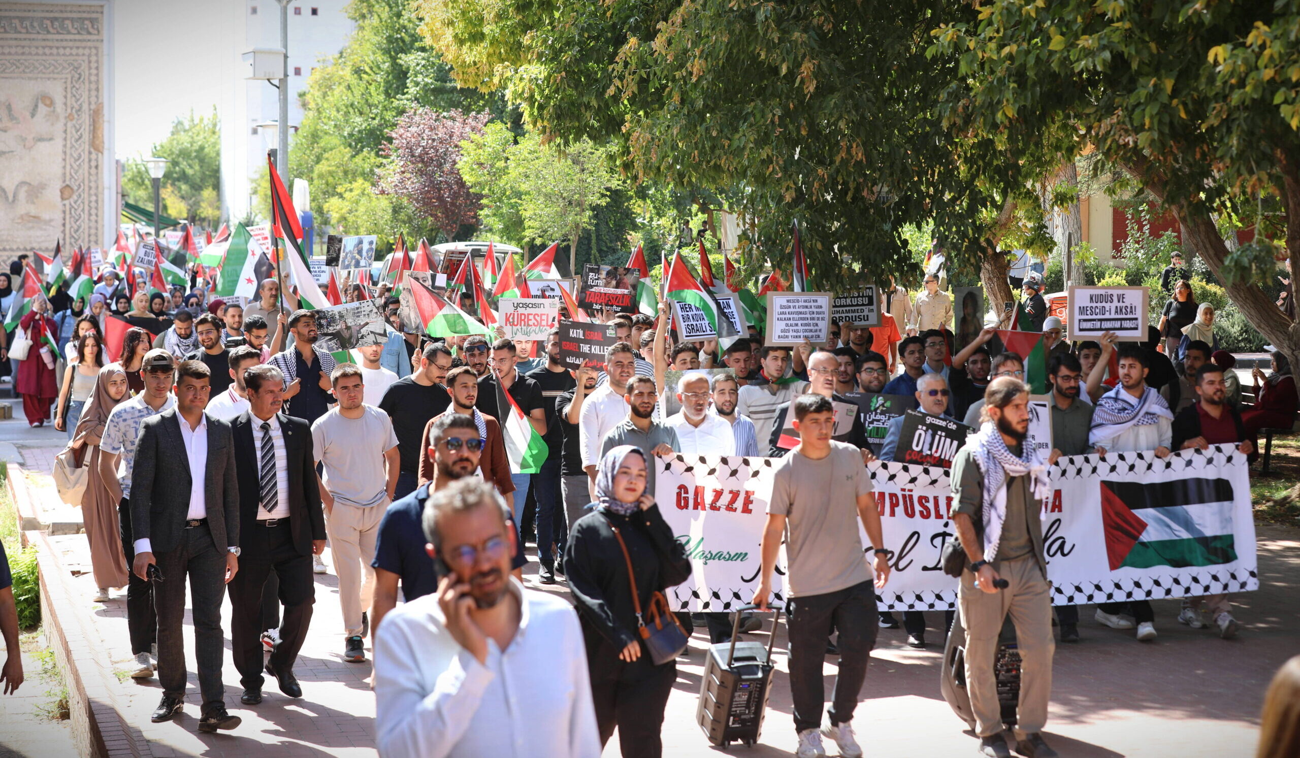 Gaziantep Üniversitesi (GAÜN) öğrencileri, Aksa Tufanı’nın 2. yıl dönümünde Filistin’e destek amacıyla yürüyüş gerçekleştirdi. GAÜN Sağlık Kültür ve Spor Daire Başkanlığı bünyesinde faaliyet gösteren sekiz öğrenci topluluğu tarafından düzenlenen etkinlik, aynı zamanda Sumud Filosuna katılan konuşmacıların paylaşımıyla Filistin direnişinin ruhunu yaşatan anlamlı bir buluşmaya dönüştü. GAÜN İlahiyat Fakültesi önünden başlayan yürüyüşte öğrenciler, İngilizce ve Türkçe “Kahrolsun İsrail”, “Gazze’de katliam var,…