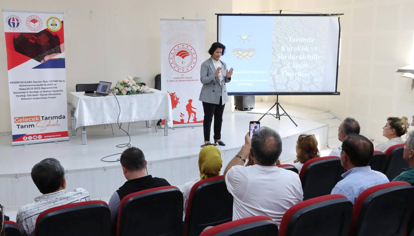 Gaziantep Üniversitesi (GAÜN) Fen-Edebiyat Fakültesi öğretim üyesi Prof. Dr. Erdihan Tunç’un yürütücülüğünü yaptığı TÜBİTAK-123Y465 numaralı “Kahramanmaraş ve Hatay Depremlerinin Gaziantep’in Nurdağı ve İslahiye İlçelerinde Yarattığı Tahribatın Toprak Ekolojisine Etkisinin Araştırılması” isimli proje kapsamında, III. Çiftçi Eğitim Semineri gerçekleştirildi. Nurdağı Belediye Salonu’nda düzenlenen seminerde, Fıstık Araştırma Enstitüsünden Dr. Serkan Kösetürkmen “Tarımda Kuraklık ve Sürdürülebilir Çözüm Önerileri” konulu sunum yaparken, Biyolog Rojda…
