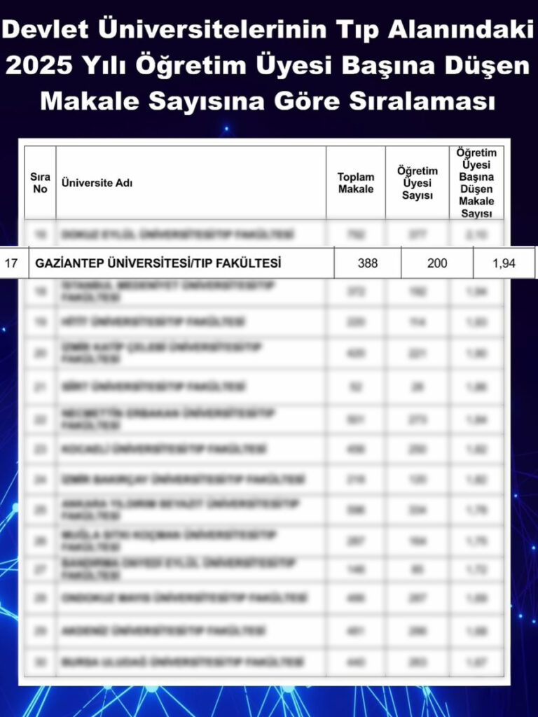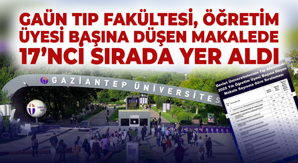 Gaziantep Üniversitesi (GAÜN) Tıp Fakültesi, devlet üniversitelerinin tıp alanına yönelik 2025 yılı akademik değerlendirmesinde öğretim üyesi başına düşen makale sayısında 17’nci sırada yer aldı.