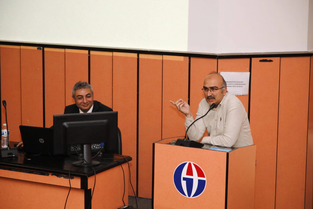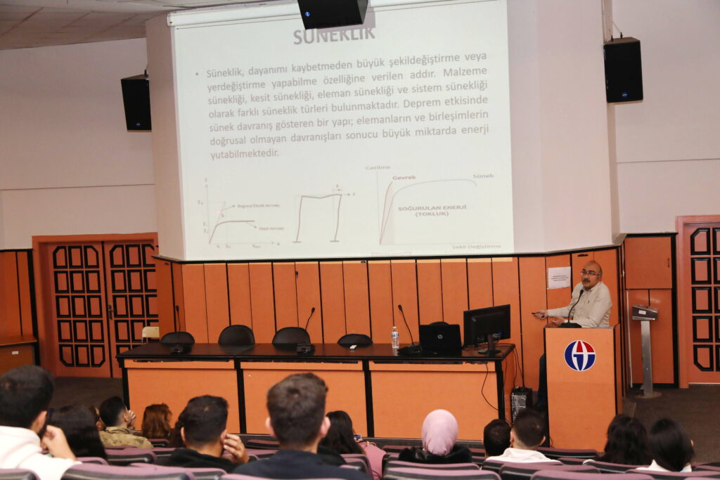 Seminerde ilk konuşmacı olarak GAÜN İnşaat Mühendisliği Bölümü öğretim üyesi Prof. Dr. Mehmet Eren Gülşan yer aldı. Prof. Dr. Gülşan, depremin büyüklüğü ve kuvveti, depreme bağlı hasarların nedenleri, depreme dayanıklı yapı tasarımı, dayanım, süreklilik ve rijitlik gibi konular üzerine detaylı sunum gerçekleştirdi. Ayrıca, deprem güvenliğini sağlamak adına taşıyıcı sistemlerin oluşturulması gerektiğinin altını çizdi.