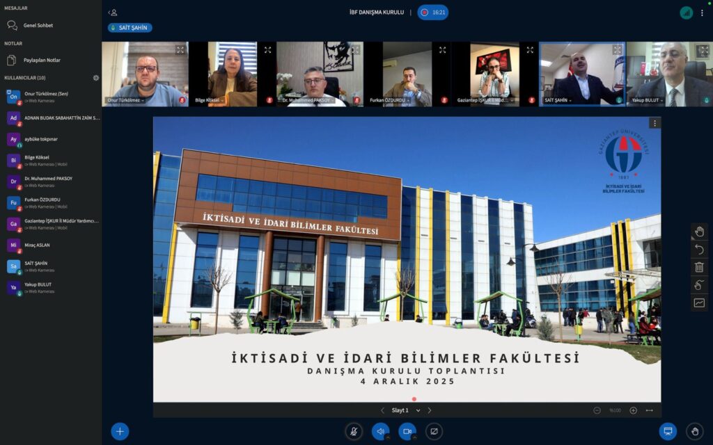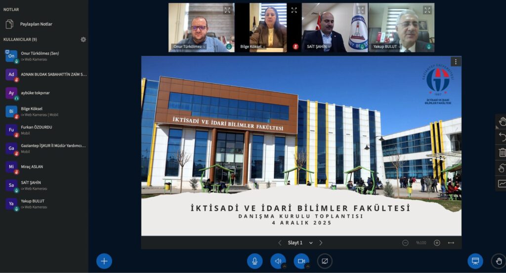 Gaziantep Üniversitesi (GAÜN) İktisadi ve İdari Bilimler Fakültesi (İİBF) Danışma Kurulu’nun 2025 yılındaki ikinci toplantısı, çevrimiçi olarak düzenlendi. Toplantıda, Mayıs ayında alınan kararlar doğrultusunda fakülte ve bölümlerindeki gelişmeler hakkında bilgi verildi, ayrıca yeni iş birlikleri için yol haritası belirlendi.