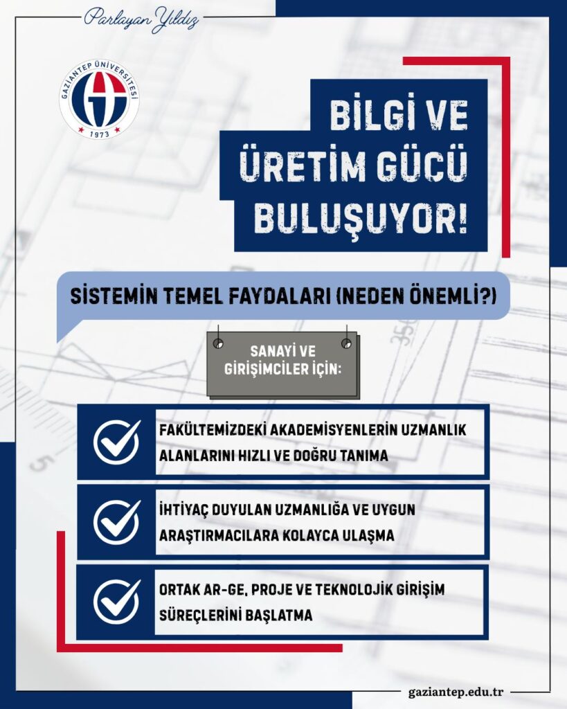 Gaziantep’in köklü sanayi kültürüne uygun olarak tasarlanan sistemin, uzun süredir ihtiyaç duyulan hızlı eşleştirme ve erişim süreçlerini kolaylaştıracağını belirten Prof. Dr. Doğan, bunun aynı zamanda üniversite–sanayi ilişkilerinde yıllardır karşılaşılan pek çok sorunun çözümüne de katkı sağlayacağını vurguladı. Rektör Doğan açıklamasında, “Üniversite–sanayi iş birliğini yalnızca bir hedef değil, gelişen ve güçlenen Türkiye’nin ön koşulu olarak değerlendiriyoruz. Sistemin diğer üniversitelerdeki araştırmacılar ile fakültemizdeki akademisyenleri eşleştirme kapasitesi, daha fazla bilimsel yayın, araştırma ve iş birliğinin ortaya çıkması anlamına gelmektedir” ifadelerine yer verdi.