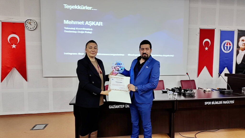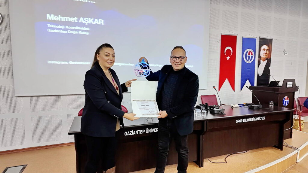 Seminerin sonunda, Doç. Dr. Zarife Pancar tarafından Gaziantep Doğa Koleji Kampüs Müdürü Ümit Ünal ile Teknoloji Koordinatörü Mehmet Aşkar’a teşekkür belgesi takdim edildi.