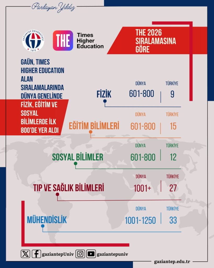THE tarafından açıklanan sonuçlara göre Gaziantep Üniversitesi; Fizik, Eğitim Bilimleri ve Sosyal Bilimler alanlarında dünya genelinde ilk 800 bandında yer aldı. Eğitim Bilimler ve Sosyal Bilimler alanında ilk kez THE alan sıralamalarına giren GAÜN, bu alanda doğrudan ilk 800 bandına yükselme başarısı gösterdi. Üniversite, Tıp ve Sağlık Bilimleri alanında 1001+, Mühendislik alanında ise 1001–1250 bandında konumlandı.