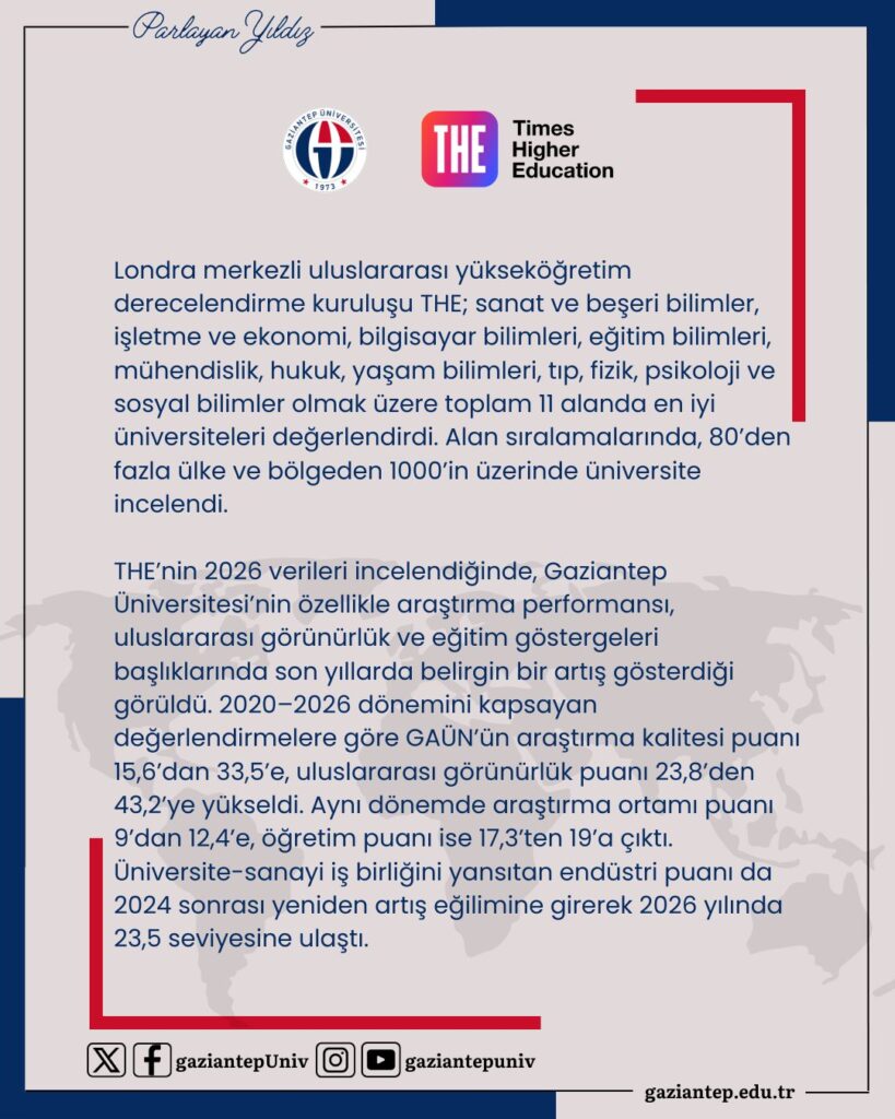 THE’nin 2026 verileri incelendiğinde, Gaziantep Üniversitesi’nin son yıllarda özellikle araştırma performansı, uluslararası görünürlük ve eğitim göstergeleri başlıklarında belirgin bir artış gösterdiği görüldü.